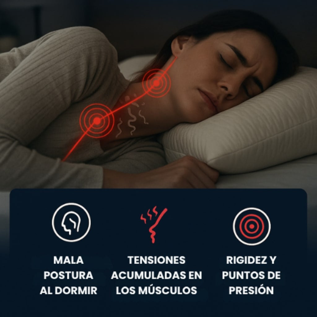 Durante la noche, una almohada demasiado alta, baja o de mala calidad obliga a los músculos cervicales y dorsales a hacer un esfuerzo constante para mantener la columna alineada. Esa tensión sostenida se acumula mientras duermes, generando rigidez, puntos de presión y ese dolor tan molesto al despertar.
